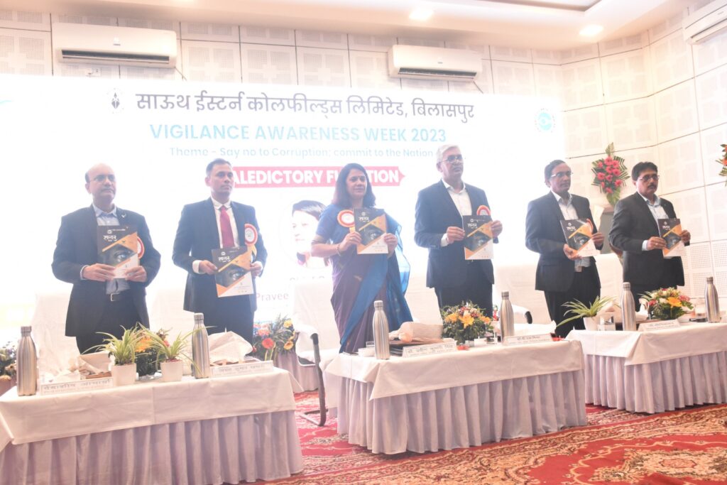 कोरबा…… साऊथ ईस्टर्न कोलफील्ड्स लिमिटेड (एसईसीएल) में सतर्कता जागरूकता सप्ताह 2023 का समापन दिनांक 08.11.2023 को हुआ । वसंत विहार स्थित रविन्द्र भवन में आयोजित समापन एवं पुरस्कार वितरण समारोह अपर सचिव केन्द्रीय सतर्कता आयोग डा. प्रवीण कुमारी सिंह (आईआरपीएस) के मुख्य आतिथ्य, अध्यक्ष सह प्रबंध निदेशक डा. प्रेम सागर मिश्रा, निदेशक (वित्त) श्री जी. श्रीनिवासन, निदेशक तकनीकी संचालन सह योजना-परियोजना श्री एस.एन. कापरी, निदेशक (कार्मिक) श्री देबाशीष आचार्या, मुख्य सतर्कता अधिकारी श्री जयंत कुमार खमारी की उपस्थिति में सम्पन्न हुआ।