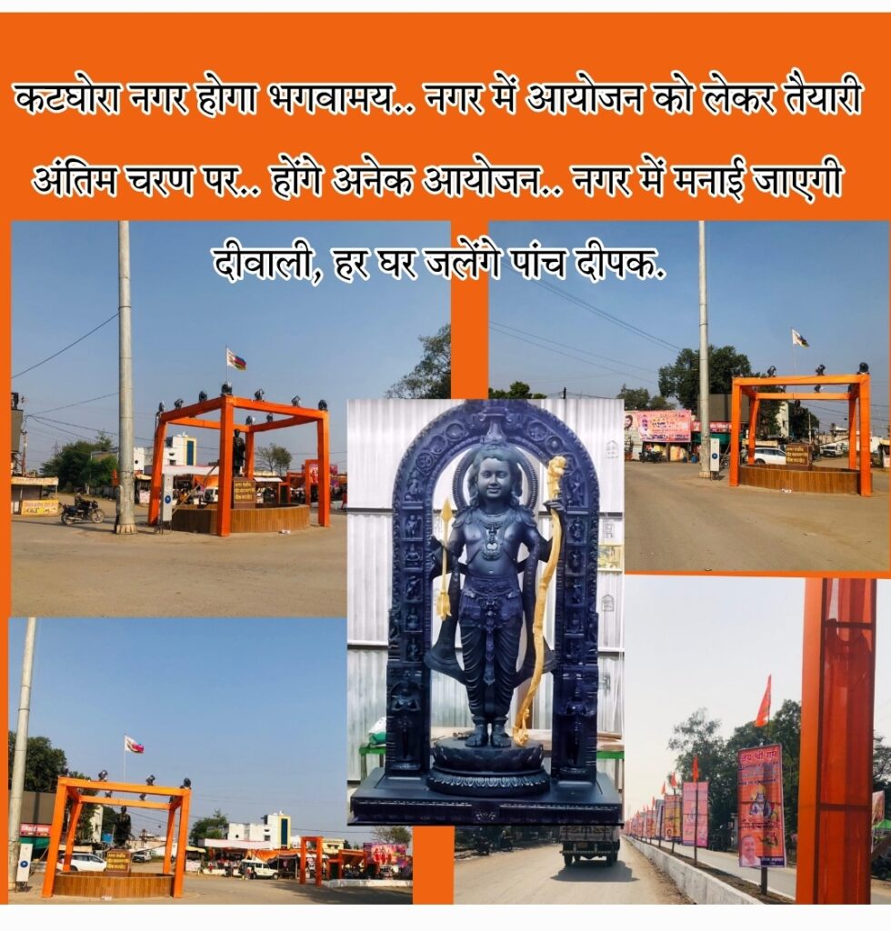 इस समय पूरे विश्व में राम मंदिर प्राण प्रतिष्ठा को लेकर कार्यक्रम आयोजित किए जा रहे हैं। जब हमारे घर में कोई मेहमान आता है, तो हम उसका स्वागत करते हैं। अब तो साक्षात प्रभु श्री राम हमारे अयोध्या में आ रहे हैं जिसे लेकर पूरे देश विदेश में जोरशोर से तैयारियां की जा रही है। कटघोरा नगर भी पूरा इस समय भगवामय हो गया है। सभी जगह भगवा तोरण, नगर के मुख्य चौराहे शहीद वीर नारायण चौक को बहुत ही सुंदर सजाया जा रहा है। कटघोरा से बिलासपुर मार्ग, कोरबा मार्ग और अम्बिकापुर मार्ग हो पूरा मुख्यमार्ग भगवामय नज़र आ रहा है। यह आयोजन किसी समिति नही अपितु सर्वसमाज के सहयोग से आयोजित किया जा रहा है। इसके लिए पूरे नगर के लोग बढ़चढ़ कर अपनी सहभागिता निभा रहे है। मुख्यमार्ग बाज़ार मोहल्ला तथा परिधान वस्त्रालय के सामने स्थित हनुमान मंदिर तथा चकचकवा पहाड़ स्थित राम मंदिर को सुदर फूल मालाओं व रोशनी से सजाया जा रहा है तथा नगर के सभी मंदिरों में सजावट व पूजा की तैयारी की जा रही है।