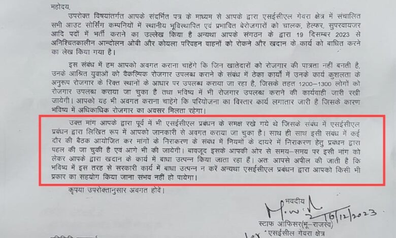 इधर दूसरी तरफ अनिश्चितकालीन आंदोलन की सूचना पर गेवरा क्षेत्र के स्टाफ ऑफिसर (भू-राजस्व) के द्वारा कहा गया है कि जिन खातेदारों को रोजगार की पात्रता नहीं बनती है, उनके आश्रित युवाओं को वैकल्पिक रोजगार कार्यकुशलता के अनुरूप रिक्त स्थानों के आधार पर ठेका कार्यों में उपलब्ध कराया जा रहा है व 1200-1300 लोगों को रोजगार उपलब्ध कराया जा चुका है तथा आगे भी जारी रहेगी। परियोजना का विस्तार कार्य लगातार जारी है, जिसके कारण भविष्य में अधिकाधिक रोजगार का अवसर मिलता रहेगा। प्रबंधन द्वारा कहा गया कि मांग के संबंध में लिखित जानकारी के साथ ही कई दौर की बैठक कर निराकरण के संबंध में नियमों के दायरे में प्रबंधन द्वारा पहल की जा चुकी है और आगे भी की जाएगी। बावजूद इसके समय-समय पर इसी मांग को लेकर खदान के कार्य में बाधा उत्पन्न किया जाता रहा है। अपील की गई है कि भविष्य में इस तरह से सरकारी कार्य में बाधा उत्पन्न न करें अन्यथा एसईसीएल प्रबंधन द्वारा आपको किसी भी प्रकार का सहयोग किया जाना संभव नहीं हो पाएगा।