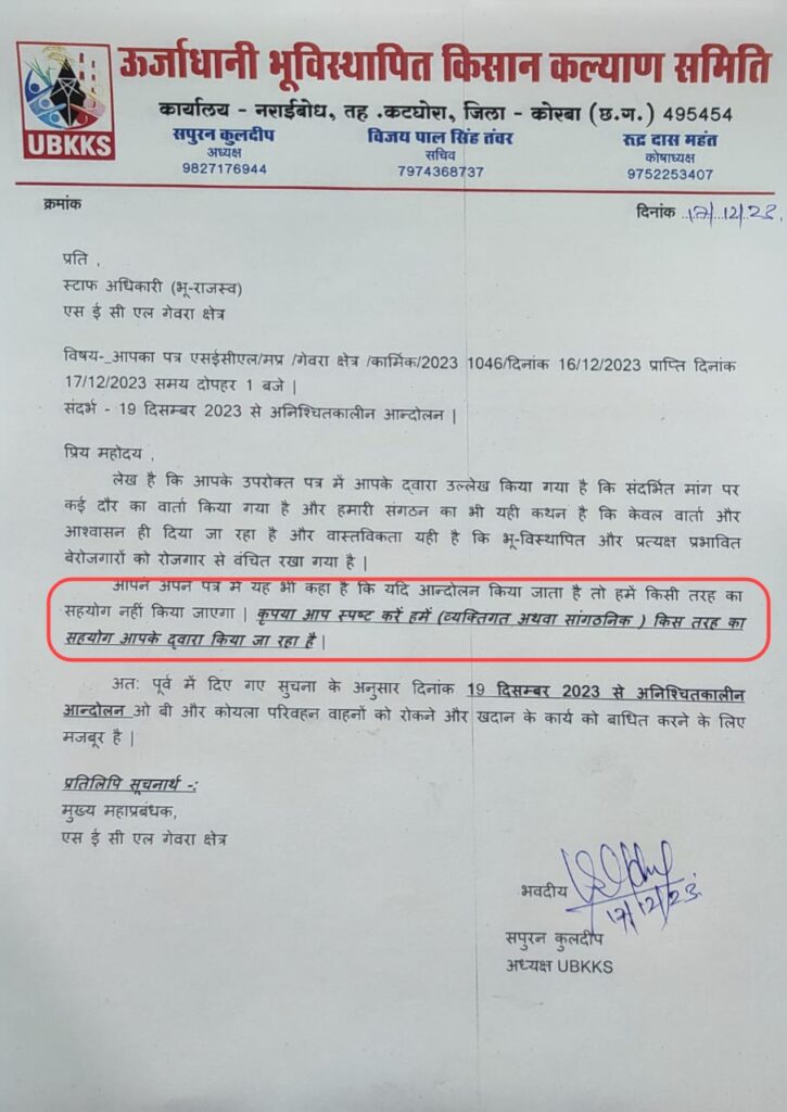 इधर प्रबंधन के इस पत्र के बाद श्री कुलदीप ने भी पत्र लिखकर यह स्पष्ट करने का आग्रह किया है कि हमें (व्यक्तिगत अथवा सांगठनिक) किस तरह का सहयोग प्रबंधन के द्वारा किया जा रहा है। पूर्व घोषणा अनुसार 19 दिसंबर से अनिश्चितकालीन आंदोलन की किया जाएगा। उन्होंने कहा है कि प्रबंधन अब आंदोलन को रोकने के लिए धमकी देने पर उतर आया है,उसका पत्र तो यही कहता है। उन्हें यह स्पष्ट करना होगा कि किसे और किस तरह का सहयोग देते रहे हैं जो आगे नहीं देने उल्लेख किया गया है। उचित जवाब न मिलने पर कानून का सहारा लेना पड़ सकता है।