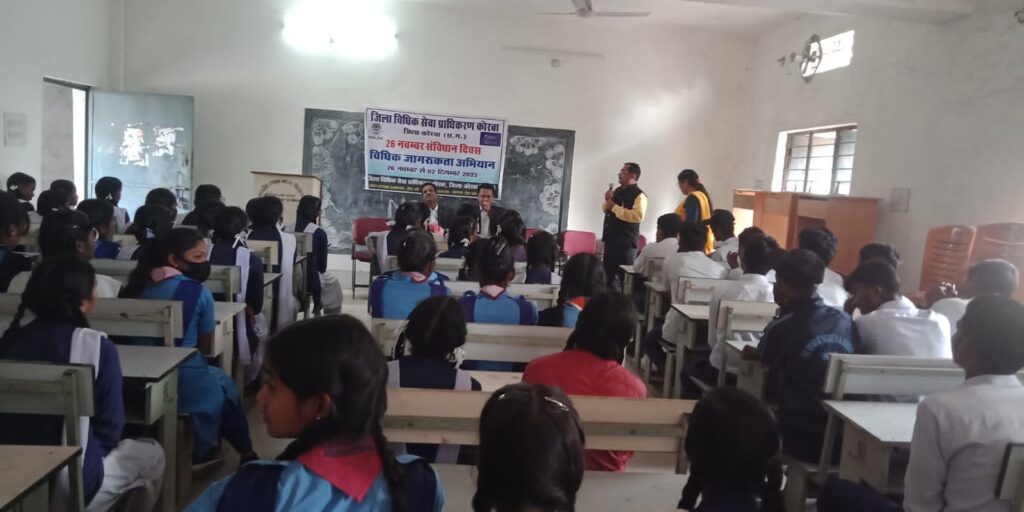 कोरबा,  राष्ट्रीय विधिक सेवा प्राधिकरण नई दिल्ली एवं छत्तीसगढ़ राज्य विधिक सेवा प्राधिकरण बिलासपुर के निर्देशानुसार 26 नवम्बर से 2 दिसंबर तक विधिक जागरुकता पर आयोजन किया जा रहा है। इसी क्रम में  शासकीय हायर सेकेण्ड्री पीडब्ल्यूडी रामपुर में जिला विधिक सेवा प्राधिकरण के अध्यक्ष व जिला न्यायाधीश डीएल कटकवार के मार्गदर्शन में न्यायिक अधिकारियों द्वारा मौलिक अधिकार एवं मौलिक कर्तव्य के संबंध में जागरुक किया गया। मुख्य अतिथि विक्रम प्रताप चन्द्रा, विशेष न्यायाधीश एफ.टी.एस.सी.(पॉक्सो) के द्वारा छात्र-छात्राओं को लंैगिक अपराधों से बालकों का संरक्षण अधिनियम 2012 के तहत् जानकारी प्रदान की गई।