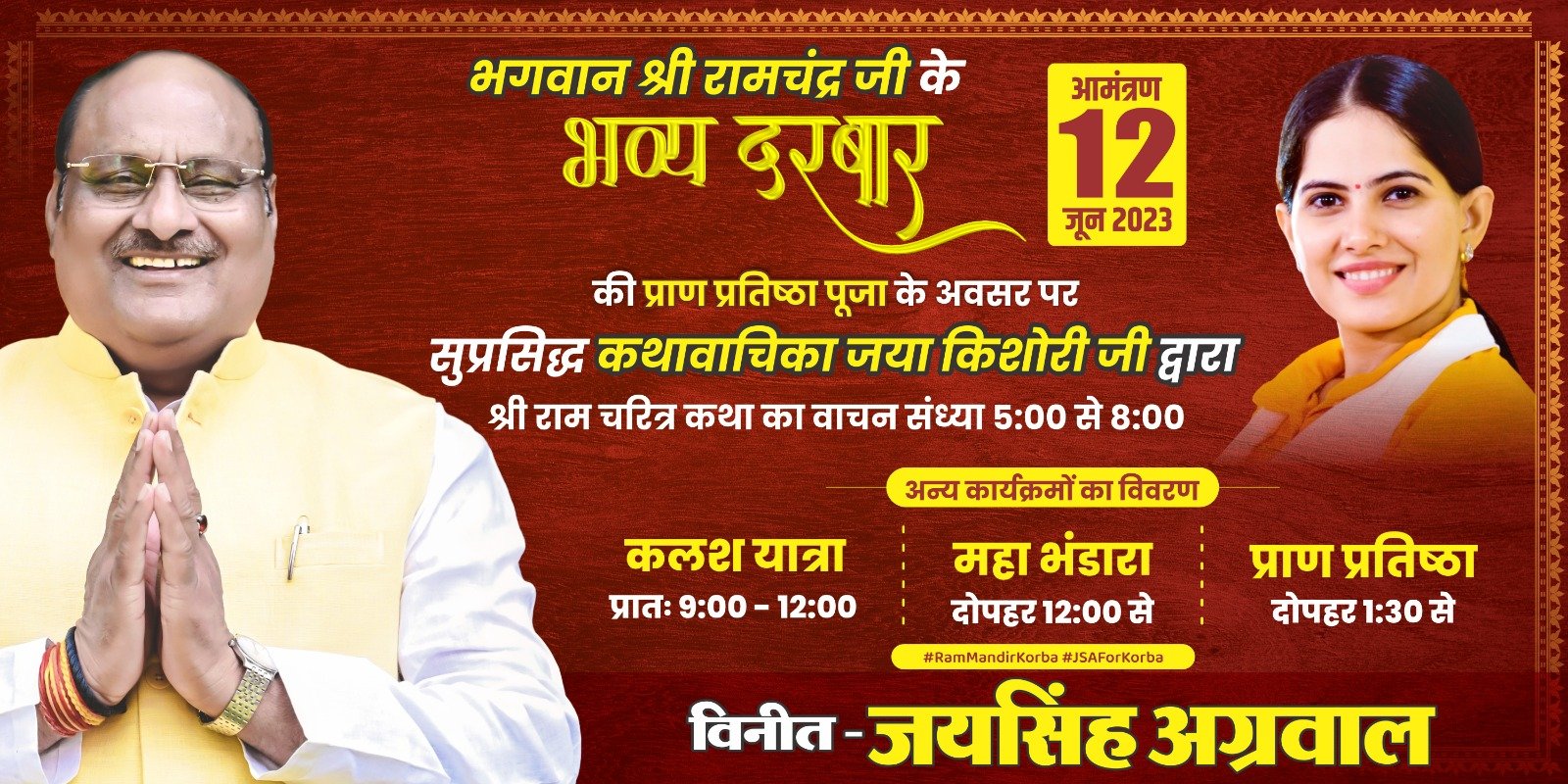 11 जून 2023 दिन रविवार को भगवान श्री रामचंद्र जी की भव्य निशान यात्रा दोपहर 03ः30 से श्री श्याम मंदिर मिशन रोड कोरबा से प्रारंभ होगी, जो कि शहर के विभिन्न मार्गाे का भ्रमण करते हुए डीडीएम स्कूल के सामने श्री राम मंदिर पहुंचेगी एवं इस निशान यात्रा के मार्ग में जहां जगह- जगह लोग राम भक्तों का स्वागत करेंगे तो वहीं पूरे कोरबा शहर में निशान यात्रा पर पुष्प वर्षा भी की जाएगी तथा भव्य निशान यात्रा के आयोजन की जिम्मेदारी देख रहे राम भक्तों ने समस्त महिलाओं को लाल या भगवा रंग के वस्त्र तथा पुरुष वर्ग को कुर्ता पायजामा पहनकर शामिल होने की अपील की है, साथ ही पूरे आयोजन को लेकर कोरबा शहर सहित कोरबा जिले के लिए विभिन्न स्थानों पर बड़े-बड़े होर्डिंग, फ्लेक्स, बैनर लगाए गए हैं, तो वही कोरबा शहर को भी झालरों की रोशनी से सुसज्जित कर दिया गया है, एवं रात्रि समय तो कोरबा शहर मानो ऐसा प्रतीत हो रहा है कि भगवान श्री रामचंद्र जी ऊर्जानगरी में पहुंचकर लोगों को आशीर्वाद दे रहे हैं, एवं कैबिनेट मंत्री जयसिंह अग्रवाल भी इस पूरे आयोजन को सफल बनाने तथा आम जनों की सहभागिता इसमें करवाने की दिशा में प्रत्येक वर्ग के लोगों से संपर्क कर उन्हें आमंत्रित कर रहे हैं तथा कोरबा शहर में पहली बार आ रही देश-दुनिया की सुप्रसिद्ध कथा वाचक जया किशोरी को सुनने के लिए भी अन्य राज्यों से भी लोग इस कार्यक्रम में पधारेंगे, तथा कार्यक्रम की भव्यता को देखते हुए जहां जिला प्रशासन एवं पुलिस प्रशासन भी तैयारियों में जोर-शोर से जुटा हुआ है, तो वहीं यह धार्मिक आयोजन कोरबा शहर के इतिहास में स्वर्ण अक्षरों में लिखा जाएगा, जिसमें निशान यात्रा एवं शोभायात्रा में हजारों की संख्या में लोग शामिल होकर भगवान श्री रामचंद्र जी का दीदार करेंगे.