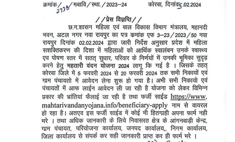 कोरबा। राज्य शासन द्वारा महिला सशक्तिकरण को बढ़ावा देने के उद्देश्य से प्रदेश में महतारी वंदन योजना 01 मार्च 2024 से लागू की गई है। महतारी वंदन योजना के लाभ लेने के लिए पात्र महिलाएं राज्य शासन की अधिकृत वेबसाइट,ऑनलाइन पोर्टल https://www.mahtarivandan.cgstate.gov.in तथा मोबाइल एप के माध्यम से आवेदन कर सकते हैं। योजना से जुड़ी फेक वेबसाइट बनाकर सोशल मीडिया के विभिन्न प्लेटफार्मो के माध्यम से वायरल की जा रही है। ऑनलाइन पोर्टल https://www.mahtarivandanyojana.info/beneficiary-apply के रूप में दर्शित लिंक फेंक व फर्जी है। इस फेक वेबसाइट, ऑनलाइन पोर्टल पर ऑनलाइन फार्म अपलोड ना करें।