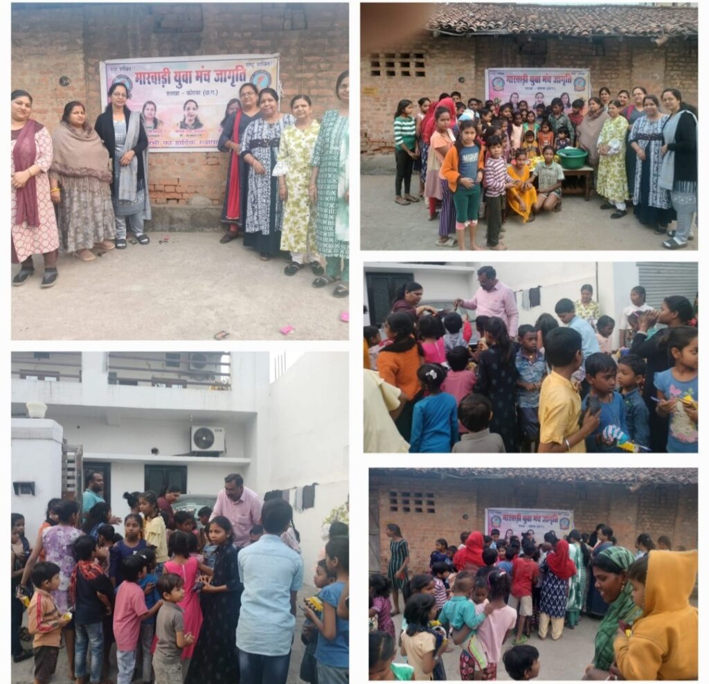 कोरबा…मारवाड़ी युवा मंच जागृति शाखा कोरबा द्वारा नन्ही मुस्कान के तहत एक प्रोग्राम आयोजित किया गया। जिसमें गरीब मजदूरों के बच्चों को सॉक्स, पैन, केक ,फ्रूटी ,टॉफी आदि सामानों का वितरण किया गया, एवं हमारे पर्यावरण की देखरेख एवं पढ़ाई के महत्व के प्रति उन्हें जागरूक किया गया। इस अवसर पर अध्यक्ष पूजा गोयल