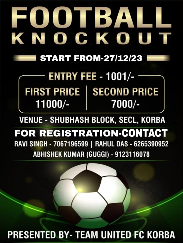 कोरबा एस ई सी एल शुभाष ब्लॉक मे 27/12/23 से मिर्ज़ा हाशिम बेग के स्मृति मे फुटबॉल टूर्नामेंट का आयोजन अमन अहमद, अभिषेक दास, साकिब अहमद,मोहसिन मेमोन,रवि सिंह, मिर्ज़ा आसिफ बेग, राहुल दास, के द्वारा किया जा रहा है जिसमे छत्तीसगढ़ के अलग अलग जिले के टीम साथ ही कोरबा जिले के टीम बढ़ चढ़ कर हिस्सा ले रही है