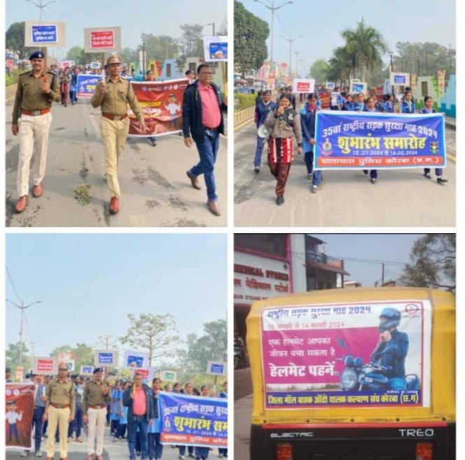 कोरबा। राष्ट्रीय सड़क सुरक्षा माह के सातवें दिवस पर थाना और यातायात पुलिस के द्वारा विभिन्न जागरूकता कार्यक्रम आयोजित किया गया। सड़क सुरक्षा जागरूकता रैली की अगुवाई रक्षित निरीक्षक कोरबा अनथराम पैकरा के द्वारा की गई। रैली में लगभग 350 लोगों ने हिस्सा लिया। यातायात पुलिस के द्वारा यातायात सड़क सुरक्षा माह के तहत सीएसईबी चौक से टीपी नगर चौक तक जागरूकता रैली निकाली गई, जिसमें सीआईएसएफ के जवान, पुलिस एवं नगर सेना के जवान, एनसीसी कैडेट, स्कूल के छात्र-छात्राएं और शहर के नागरिकों ने हिस्सा लिया। यातायात पुलिस और एनएसएस के छात्र-छात्राओं के द्वारा शहर के विभिन्न चौक चौराहों पर ट्रैफिक पुलिस के साथ मिलकर यातायात नियमों का पालन करने के लिए राहगीरों को बताया गया। यातायात नियमों का पाठ पढ़ाने के लिए पुलिस का साथ देने अब ऑटो संघ ने भी इस महिम में अपना साथ दिया है। पुलिस मुख्यालय नवा रायपुर के निर्देशानुसार एवं पुलिस अधीक्षक जितेन्द्र शुक्ला के मार्गदर्शन पर 15 जनवरी को जिला कोरबा में राष्ट्रीय सड़क सुरक्षा माह 2024 का शुभारंभ किया गया। राष्ट्रीय सड़क सुरक्षा माह में प्रतिदिन थानों व यातायात पुलिस द्वारा विधिक जागरूकता कार्यक्रम कर जिलेवासियों को यातायात के प्रति जागरूक किया जावेगा। साथ ही कोरबा पुलिस के द्वारा सभी थाना/चौकी अंतर्गत वाहन चेकिंग के दौरान यातायात नियम के पालन नहीं करने वालों बाइक सवार एवं चार पहिया वाहन चलने वाले राहगीरों को यातायात संबंधी जानकारी देकर यातायात नियम का पालन करने चॉकलेट देकर निवेदन किया गया है और उनको हिदायत भी दिया गया।