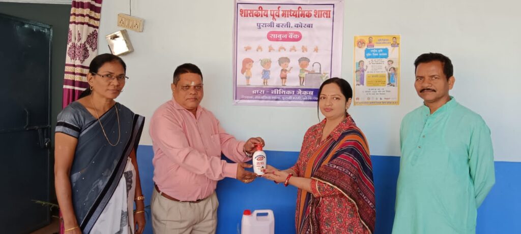 कोरबा,संकुल_ कोरबा की शिक्षिका श्रीमती नीतिका जेकब ने स्वयं के खर्च से स्कूल में *साबुन बैंक* की शुरुआत की है और बच्चों को नियमित रूप से हाथ धोने हेतु प्रेरित किया। ताकि बच्चे स्वच्छता के प्रति सजग रहें।इन्होंने बताया हाथ ना धोने की वजह से 40% रोग बच्चों को होते हैं अतः भोजन से पूर्व बच्चों में साबुन से हाथ धोने की आदत विकसित हो इसलिए इन्होंने स्कूल में साबुन बैंक की शुरुआत की है।इसके लिए उन्होंने 5 लीटर हैंड वॉश *साबुन बैंक* हेतु शाला के प्रधान पाठक श्री जे. पी. कोशले सर जी को भेंट किया। इसके साथ ही इन्होंने अन्य लोगों ,बच्चों और जन समुदाय से भी आह्वान किया है,कि वह भी विभिन्न अवसरों पर या स्वेच्छा से शाला के साबुन बैंक में साबुन का दान करें। *साबुन बैंक* को लेकर पंजी का भी संधारण किया जाएगा और इसकी जिम्मेदारी शाला में संचालित बाल संसद के स्वच्छता मंत्री को दी गई है।