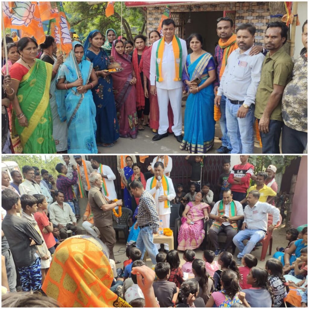 भाजपा प्रत्याशी लखनलाल देवांगन जनता को बता रहे अपना घोषणा पत्र