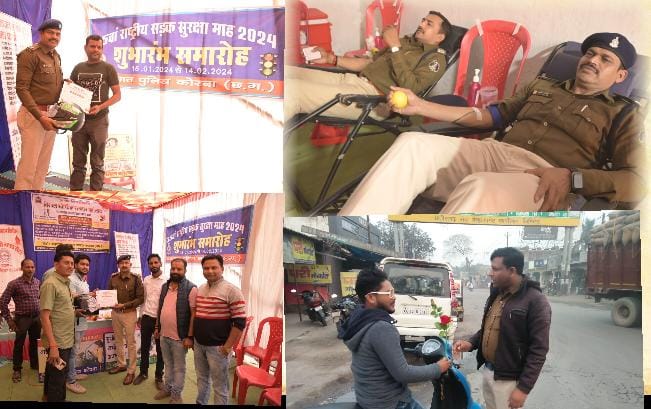 कोरबा। पुलिस मुख्यालय नवा रायपुर के निर्देशानुसार एवं पुलिस अधीक्षक जितेन्द्र शुक्ला के मार्गदर्शन पर 15 जनवरी को जिला कोरबा में राष्ट्रीय सड़क सुरक्षा माह 2024 का शुभारंभ किया गया। राष्ट्रीय सड़क सुरक्षा माह में प्रतिदिन थानों व यातायात पुलिस द्वारा विधिक जागरूकता कार्यक्रम कर जिलेवासियों को यातायात के प्रति जागरूक किया जावेगा। राष्ट्रीय सड़क सुरक्षा माह के तृतीय दिवस पर बाकीमोगरा मैं रक्तदान शिविर के साथ-साथ हेलमेट वितरण का कार्यक्रम किया गया। हंसवाहिनी ब्लड सेंटर के तरफ से रक्तदान शिविर में बाकीमोगरा थाना प्रभारी के साथ-साथ यातायात के अधिकारी कर्मचारीयों के द्वारा रक्तदान की किया साथ ही पुलिस के द्वारा हेलमेट वितरण कर हेलमेट की उपयोगिता के बारे में बताया गया। साथी कोरबा पुलिस के द्वारा सभी थाना एवं चौकी अंतर्गत वाहन चेकिंग के दौरान यातायात नियम के पालन नहीं करने वालों बाइक सवार एवं चार पहिया वाहन चलने वाले राहगीरों को यातायात संबंधी जानकारी देकर यातायात नियम का पालन करने पुष्प गुच्छा देकर निवेदन किया गया है और उनको हिदायत भी दिया गया।अपील: कोरबा पुलिस और यातायात के द्वारा प्रत्येक व्यक्ति से निवेदन करता है कि यातायात के नियमों का शत प्रतिशत पालन करें, तो दुर्घटना मुक्त भारत की कल्पना साकार हो सकती है