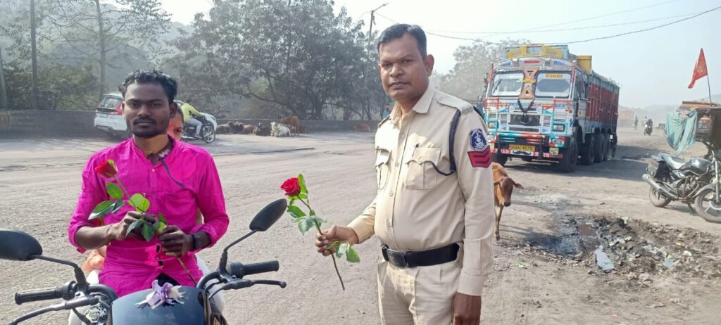कोरबा, 16 जनवरी । पुलिस मुख्यालय नवा रायपुर के निर्देशानुसार एवं पुलिस अधीक्षक जितेन्द्र शुक्ला के मार्गदर्शन पर 15 जनवरी को जिला कोरबा में राष्ट्रीय सड़क सुरक्षा माह 2024 का शुभारंभ किया गया। राष्ट्रीय सड़क सुरक्षा माह में प्रतिदिन थानों व यातायात पुलिस द्वारा विधिक जागरूकता कार्यक्रम कर जिलेवासियों को यातायात के प्रति जागरूक किया जावेगा।राष्ट्रीय सड़क सुरक्षा माह के द्वितीय दिवस पर सर्वमंगला चौक के पास सर्वमंगला चौकी प्रभारी विभव तिवारी एवं स्टाफ के द्वारा सड़क सुरक्षा सप्ताह के अंतर्गत यातायात नियम के पालन नहीं करने वालों बाइक सवार एवं चार पहिया वाहन चलने वाले राहगीरों को यातायात संबंधित जानकारी देकर यातायात नियम का पालन करने पुष्प गुच्छा देकर निवेदन किया गया है ।