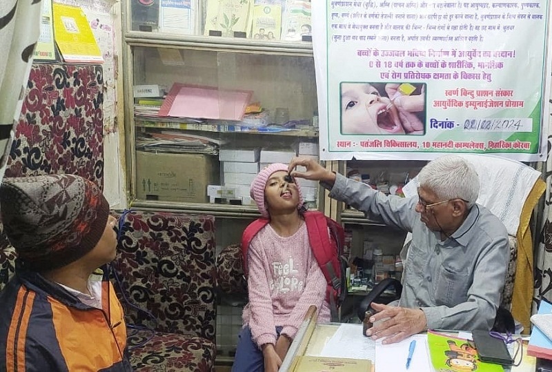 कोरबा। चलो आयुर्वेद की ओर मिशन के तहत बच्चों में रोग प्रतिरोधक क्षमता बढ़ाने के लिए बच्चे रहे स्वस्थ योजनान्तर्गत अति शुभ पुष्य नक्षत्र में पतंजलि चिकित्सालय निहारिका में आयुर्वेदिक इम्यूनाईजेसन प्रोग्राम के तहत स्वर्ण बिंदु प्राशन संस्कार शिविर लगाया गया। संस्थान के संस्थापक नाड़ी वैद्य पंडित शिव कुमार शर्मा ने बच्चों को स्वर्ण बिंदु प्राशन ड्रॉप्स पिलाकर आयुर्वेद पद्धति से टीकाकरण किया।