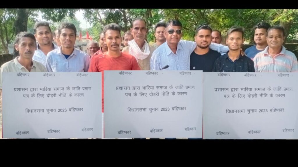 क्षेत्रीय भारिया जनजाति समाज जिला कोरबा ने प्रशासन द्वारा जाति प्रमाण पत्र नहीं बनाए जाने के कारण 31 अगस्त को कलेक्टर सह जिला निर्वाचन अधिकारी कोरबा को पत्र प्रस्तुत किया था। उन्हें अवगत कराया गया था कि भारिया समाज के लोगों को जाति प्रमाण पत्र बनाने में किस तरह की तकनीकी परेशानी से जूझना पड़ रहा है। पत्र में जाति प्रमाण पत्र जारी किए जाने के लिए प्रशासन को पांच दिवस के भीतर सकारात्मक निर्णय लिए जाने समय दिया गया था। पर कोई उचित निर्णय नहीं लिए जाने की बात करते हुए क्षेत्रीय भारिया जनजाति समाज ने कोरबा विधान सभा चुनाव 2023 का बहिष्कार कर दिया है। समाज का कहना है कि आज दिनाक तक हमारे समस्या का समाधान नहीं किए जाने के कारण हम सभी क्षेत्रीय भारिया जनजाति समाज कोरबा के लोग आज से विधानसभा चुनाव 2023 का पूर्ण रूप से बहिष्कार करते हैं। भरिया समाज के लोगों में इस बात पर आक्रोश है कि उनका जाति प्रमाण पत्र बनाने के लिए दो अलग-अलग तरह का नियम लागू किया गया है। तहसील कार्यालय से अस्थाई प्रमाण पत्र बनाया जा रहा है लेकिन एसडीएम से उसे स्थाई नहीं किया जा रहा है। दूसरे एसडीएम के द्वारा यह कार्य आसानी से हो रहा है। एक जिले में भारिया जनजाति के लिए दो अलग-अलग नियम आखिर क्यों बनाए गए हैं, इस बात से भारी नाराजगी व्याप्त है।