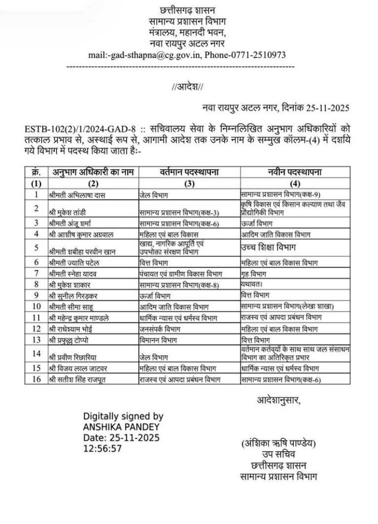 HomeUncategorized November 25, 2025 Dinesh Patkar FacebookInstagramXYoutube Latest Posts कोरबा कोरबा के अधीक्षण अभियंता सहित कटघोरा के कार्यपालन अभियंता निलंबित Uncategorized हेल्थ न्यूज़:एमएम नारायणा में विश्व क्षय दिवस पर निशुल्क चेस्ट एक्स-रे व परामर्श पर 50 प्रतिशत छूट बिलासपुर ईस्ट-वेस्ट रेल कॉरिडोर अंतर्गत गेवरारोड–पेंड्रा रोड नई रेल लाइन निर्माण कार्य में महत्वपूर्ण प्रगति बिलासपुर रेलवे सुरक्षा बल द्वारा अवैध गतिविधियों के विरुद्ध प्रभावी कार्यवाही एवं उल्लेखनीय उपलब्धियां CG News: देखिए पूरी सूची….. 16 अधिकारियों का हुआ तबादला By Dinesh Patkar Date: November 25, 2025 Share FacebookXPinterestWhatsApp Cg news: रायपुर। सचिवालय सेवा के अनुभाग अधिकारियों को तत्काल प्रभाव से विभिन्न विभाग में तबादला किया गया है। सामान्य प्रशासन विभाग मंत्रालय की ओर से जारी आदेश से 16 अधिकारी प्रभावित हुए हैं। Tags:raipur news November 25, 2025 Dinesh Patkar FacebookInstagramXYoutube RELATED ARTICLES Uncategorized हेल्थ न्यूज़:एमएम नारायणा में विश्व क्षय दिवस पर निशुल्क चेस्ट एक्स-रे व परामर्श पर 50 प्रतिशत छूट Uncategorized भाजपा सरकार छत्तीसगढ़ को नशागढ़ और अफीम चटाकर “उड़ता छत्तीसगढ़” बना रही Uncategorized कोरबा-पाली। अधिवक्ता संघ पाली के वरिष्ठ सदस्य, दिलीप जायसवाल निवासी ग्राम -परसदा का आज आकस्मिक निधन हो गया। वे स्व. हीरालाल जायसवाल के पुत्र... Uncategorized डीएसपी कल्पना का हो सकता हैँ निलंबन,नक्सलीयो से भी सम्बन्ध के आरोप! Uncategorized एक स्टेशन एक उत्पाद, भारतीय रेल के माध्यम से क्षेत्रीय पहचान को बढ़ावा Latest Posts कोरबा कोरबा के अधीक्षण अभियंता सहित कटघोरा के कार्यपालन अभियंता निलंबित Uncategorized हेल्थ न्यूज़:एमएम नारायणा में विश्व क्षय दिवस पर निशुल्क चेस्ट एक्स-रे व परामर्श पर 50 प्रतिशत छूट बिलासपुर ईस्ट-वेस्ट रेल कॉरिडोर अंतर्गत गेवरारोड–पेंड्रा रोड नई रेल लाइन निर्माण कार्य में महत्वपूर्ण प्रगति बिलासपुर रेलवे सुरक्षा बल द्वारा अवैध गतिविधियों के विरुद्ध प्रभावी कार्यवाही एवं उल्लेखनीय उपलब्धियां Don't Miss Uncategorized हेल्थ न्यूज़:एमएम नारायणा में विश्व क्षय दिवस पर निशुल्क चेस्ट एक्स-रे व परामर्श पर 50 प्रतिशत छूट Uncategorized भाजपा सरकार छत्तीसगढ़ को नशागढ़ और अफीम चटाकर “उड़ता छत्तीसगढ़” बना रही Uncategorized कोरबा-पाली। अधिवक्ता संघ पाली के वरिष्ठ सदस्य, दिलीप जायसवाल निवासी ग्राम -परसदा का आज आकस्मिक निधन हो गया। वे स्व. हीरालाल जायसवाल के पुत्र... Uncategorized डीएसपी कल्पना का हो सकता हैँ निलंबन,नक्सलीयो से भी सम्बन्ध के आरोप! Uncategorized एक स्टेशन एक उत्पाद, भारतीय रेल के माध्यम से क्षेत्रीय पहचान को बढ़ावा