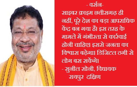 सुनील सोनी ने कॉलर से कहा कि मैं छत्तीसगढ़ रायपुर से विधायक हूं तो ठग ने कहा कि हमारा आदमी आपको कॉल करेगा, आपको अरेस्ट करेगा। शक हुआ तो विधायक सुनील सोनी ने एसएसपी को बातचीत की जानकारी दी। साइबर थाने में भी लिखित शिकायत की है। इस घटना के बाद विधायक सुनील सोनी ने लोगों से अपील की है कि ऐसी घटना होने पर तुरंत थाने में सूचना दे। इस फ्रॉड से बचने का दूसरा कोई रास्ता नहीं है। ठग इस तरह बातचीत करते हैं कि लोग सोचने पर मजबूर हो जाते हैं, लेकिन डरने की जरूरत नहीं है। पुलिस कार्रवाई करेगी।