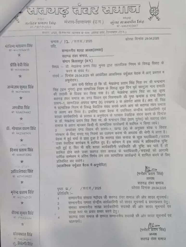 सतगढ़ तंवर समाज ने अपनी दंड विधान एवं नियमावली में अंतरजातीय विवाह को सामाजिक अपराध की श्रेणी में रखा है। नियमावली के पृष्ठ क्रमांक 5, दंड विधान प्रारूप-1, खंड (व), उपखंड 2 के अनुसार, इंटरकास्ट मैरिज को अपराधिक कृत्य माना गया है। समाज की बैठक में अध्यक्ष मनोहन प्रताप सिंह, विरेन्द्र कुमार सिंह, श्रवण सिंह और महेन्द्र पाल सिंह ने कहा कि डॉ. सिंह ने समाज के नियमों का उल्लंघन किया है। 28 अप्रैल 2025 को समाज के आधिकारिक लेटर पैड पर आदेश जारी कर डॉ. सिंह और उनके परिवार को समाज से बहिष्कृत कर दिया गया। उन्हें भविष्य में किसी भी सामाजिक कार्यक्रम में शामिल होने से प्रतिबंधित कर दिया गया।