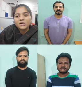 शुभम कॉर्पोरेट्स आदित्य हाईट्स ए-501 थाना तेलीबांधा निवासी विधि अग्रवाल पिता महेश अग्रवाल (27), उसका साथी जी.टी. हाईट्स शंकर नगर थाना सिविल लाईन रायपुर निवासी ऋषी राज टंटन पिता, नव्या मलिका का साथ दलदली रोड महासमुंद निवासी सोहेल खान पिता सिकंदर खान (29) एंव बैद्यनाथ पारा धोबीगली थाना सिटी कोतवाली निवासी जुनैद अख्तर पिता जाहिर अख्तर (28) को गिरफ्तार किया गया है।