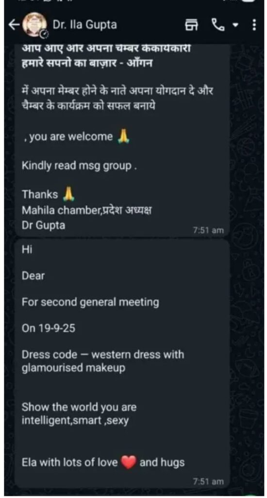 यह मैसेज महिला चैंबर ऑफ कॉमर्स की 19 सितंबर को प्रस्तावित बैठक के लिए कुछ महिलाओं को भेजा गया था। इस मैसेज में पार्टी ड्रेस कोड को लेकर विशेष निर्देश दिए गए थे, जिसे लेकर आपत्ति जताई गई है।