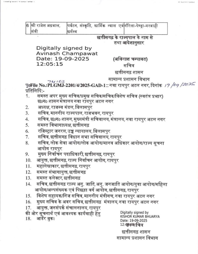 जबकि नये मंत्रियों में शिक्षा मंत्री गजेंद्र यादव को राजनांदगांव का, गुरु खुशवंत साहेब को सक्ती का और राजेश अग्रवाल को गौरेला पेंड्रा मरवाही जिले का प्रभार दिया गया है।