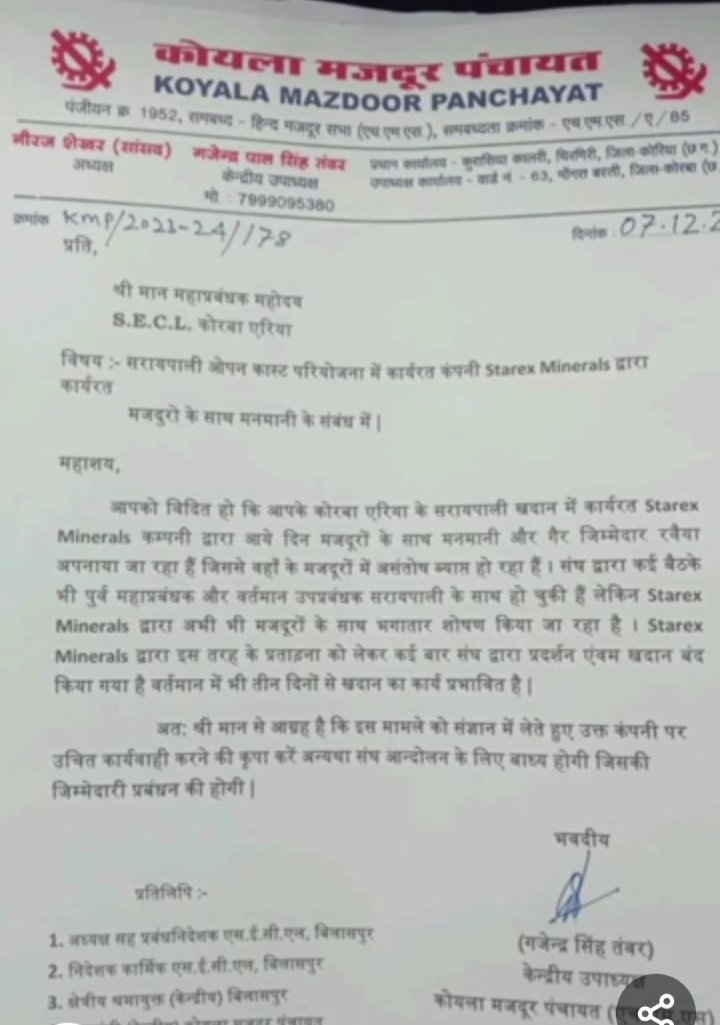 दरअसल, सराईपाली ओपन कास्ट परियोजना में कार्यरत ठेका कंपनी स्टारएक्स मिनरल्स पर मजदूरों ने मनमानी का आरोप लगाया है। इस संबंध में कोयला मजदूर पंचायत के केन्द्रीय उपाध्यक्ष गजेन्द्र सिंह तंवर ने कोरबा एरिया महाप्रबंधक के नाम लेटर लिखा है।
